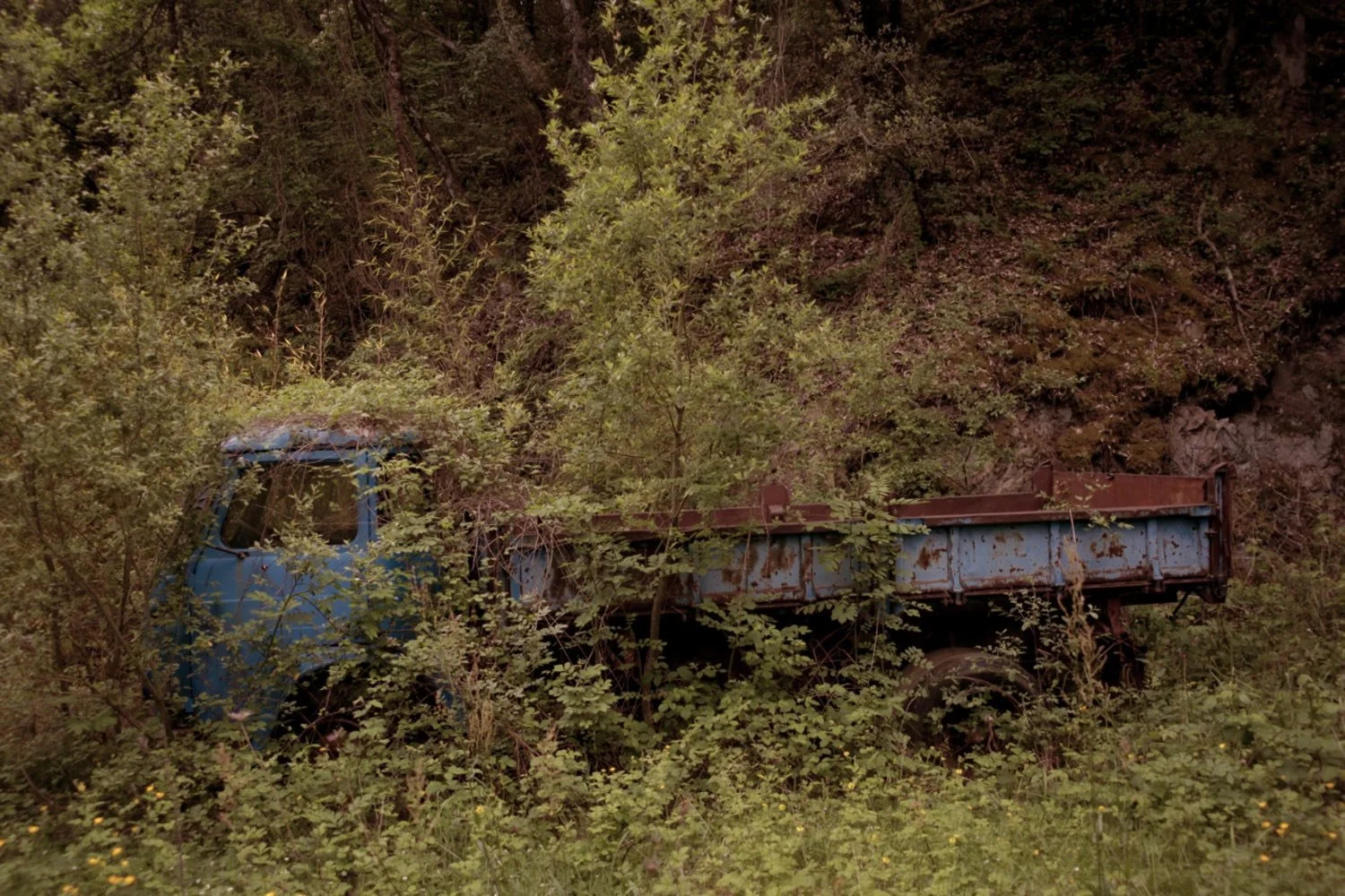 Except that summer days are long, and a “No Entry” sign brings out the twelve-year-old in me. So, as the overgrown pasture settled into meadow, my attention was lured past that sign and into that modest beyond. It was a year or two before the arrival of Filip. Crouching under the gate and then filleting my way through the brambles I came upon a clearing set into a cleft in the hillside. There I found a broken-down, blue truck rusting in a thicket of bamboo. I could pull the door open just enough to climb inside. The smell of disintegrating seat-leather, hot dashboard-plastic and trapped heat was overwhelming. An empty, long-ago clenched cigarette packet lay in the footwell.